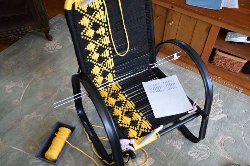 The solution was to start with a horizontal “bridge” that would hold vertical strings up off the frame. In this case, it is the black band of color on the chair. I made a guess as to the best position for the bridge. But I wouldn’t know if I got it right until I could sit on it.